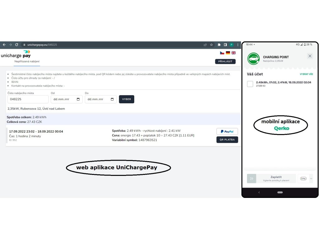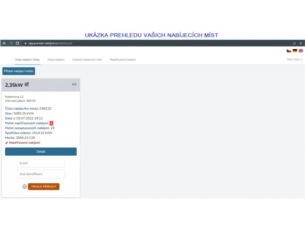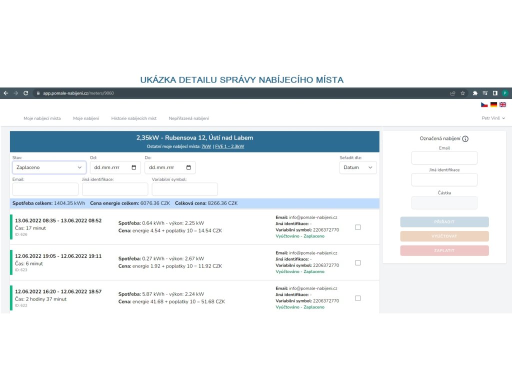 Ukázka software pro nabíjecí zásuvky. Pohled zákazníka, zaměstnance, nájemníka, který nabíjí.